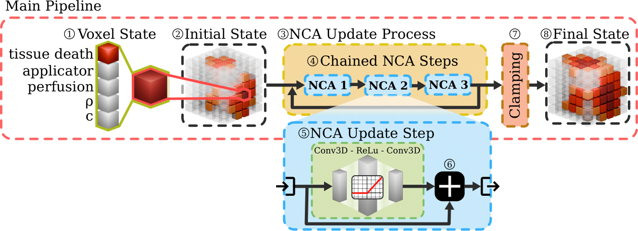 We introduced an approach to estimate the heat induced tissue death in percutaneous thermal ablation based on a chained NCA architecture. While not directly producing a heat map, it accurately estimates cell death induced by thermal damage by implicitly modeling temperature field effects and evolution, going beyond heat distribution, with low root mean square error and high speed. The model is computationally efficient, characterized by a mere 12,210 learned parameters, and is capable of operating on a standard desktop computer due to its implementation through basic 3D convolutions. It can compute 25 minutes of treatment at a frequency up to 476 fps, making it suitable for interactive simulations and optimization loops.